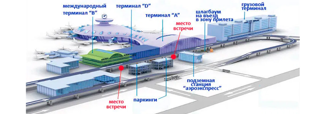 - зону прилета с уровня земли (здесь останавливается общественный транспорт, а также находятся многоэтажные паркинги);