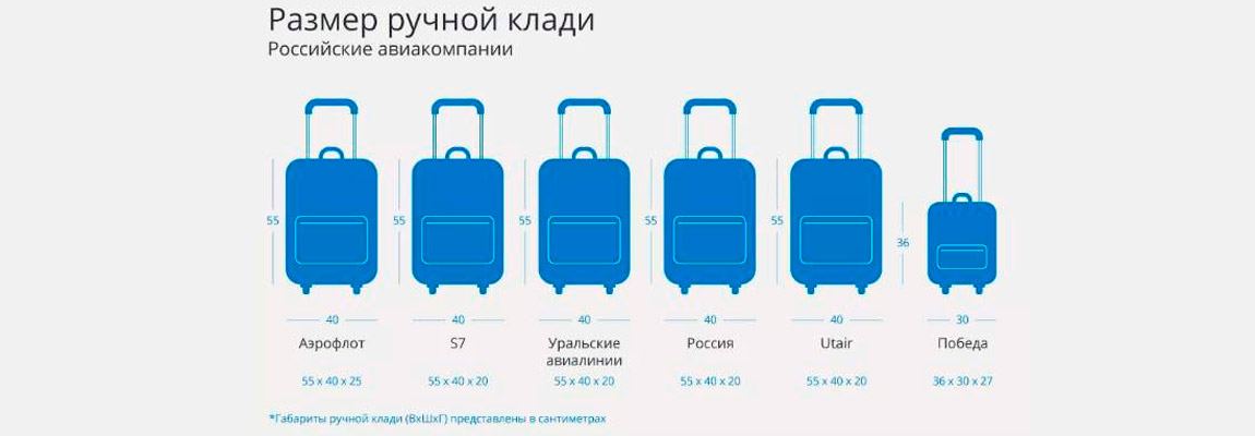 Максимально допустимый вес ручной клади устанавливает авиакомпания, как правило в салон разрешают брать не больше 5–10 кг. Самые распространенные лимиты по габаритам (ширина×высота×глубина): 55×40×23 см. Но лоукостеры нередко ограничивают пассажиров сильнее, например, «Победа» разрешает брать на борт без дополнительной платы ручную кладь не крупнее 36×30×27 см.